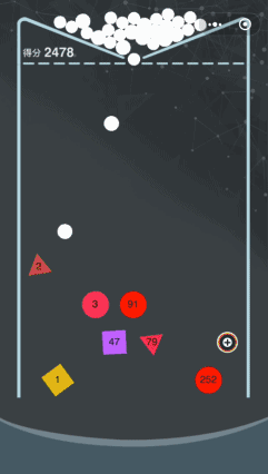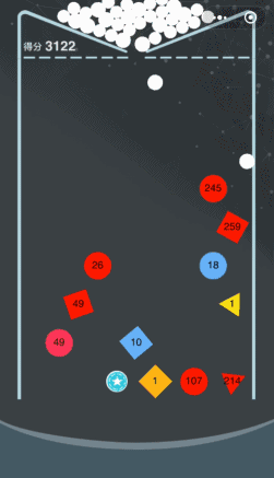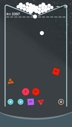 上面说到,除了数字色块,还有两种特殊效果的色块,分别是 “ + ” 和 “ ☆ ” ,当球碰到 “ + ” 块时会分裂成两个,而碰到 “ ☆ ” 块时则会变大,这两个特殊效果的块碰一下就会消失。